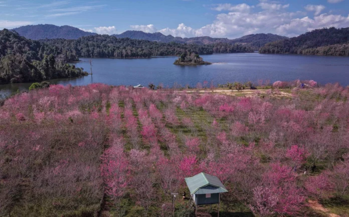 Hàng chục nghìn gốc hoa anh đào Nhật Bản trồng trên đảo giữa hồ Pá Khoang, Điện Biên đồng loạt khoe sắc, thu hút du khách trước thềm lễ hội sắp diễn ra.