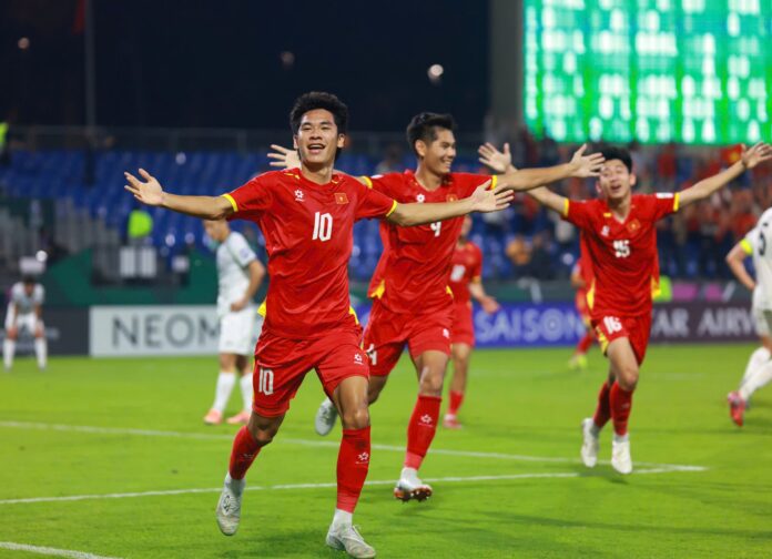 Và đỉnh cao mới nhất của Văn Thuận? Đó chính là đêm 9/1/2026 tại Saudi Arabia. Trong trận đấu “nghẹt thở” với U23 Kyrgyzstan ở VCK U23 Châu Á, khi tất cả đang hồi hộp đến tột độ, Văn Thuận bất ngờ được tung vào sân từ ghế dự bị. Phút 87, anh tung ra cú đánh đầu “quý hơn vàng”, không chỉ ấn định chiến thắng 2-1 mà còn chính thức mở toang cánh cửa vào tứ kết sớm cho U23 Việt Nam. Hình ảnh Văn Thuận dang rộng hai tay ăn mừng theo phong cách “Bellingham” đã lan truyền chóng mặt khắp mạng xã hội, kéo theo những lời tán dương không ngớt từ AFC và đặc biệt là FIFA. Cả trang chủ của hai tổ chức bóng đá lớn này đều không ngần ngại đăng tải bức ảnh của Văn Thuận cùng những lời khen có cánh, một vinh dự không phải ai cũng có được!